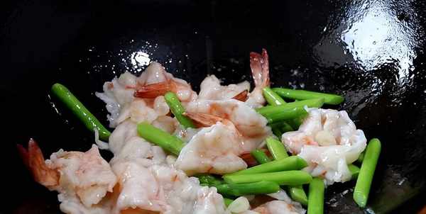 4、锅内倒入一点油,放入蒜片炒香,把芦笋和虾片倒入锅内,淋上一点用盐、白胡椒粉、鸡精水淀粉调的芡汁,芡汁透亮浓稠裹在食材表面就可以了。