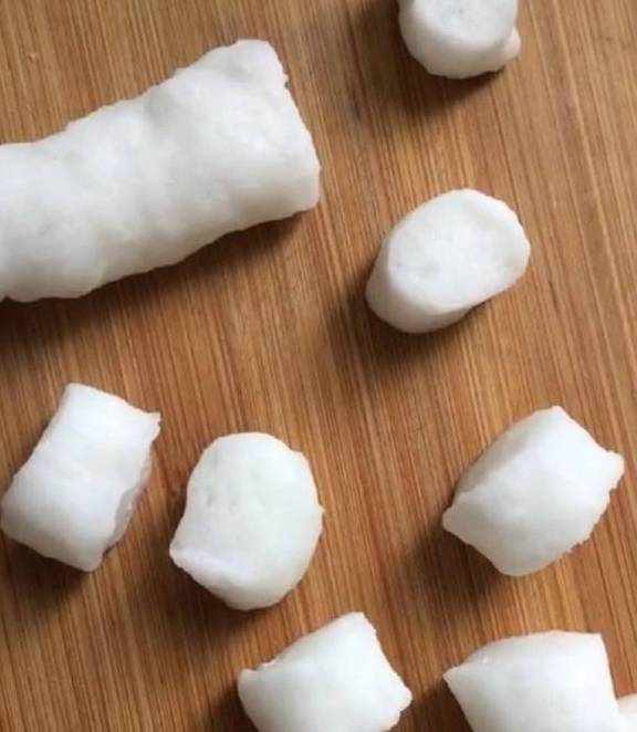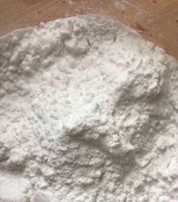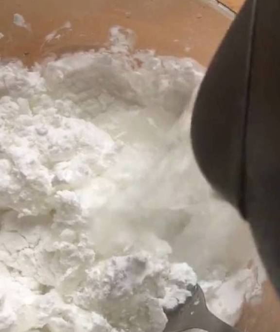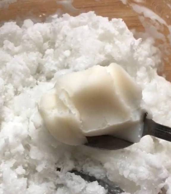 第一步:和面,这里用的粉是土豆淀粉+开水,用勺子搅拌成棉絮状