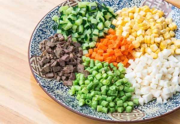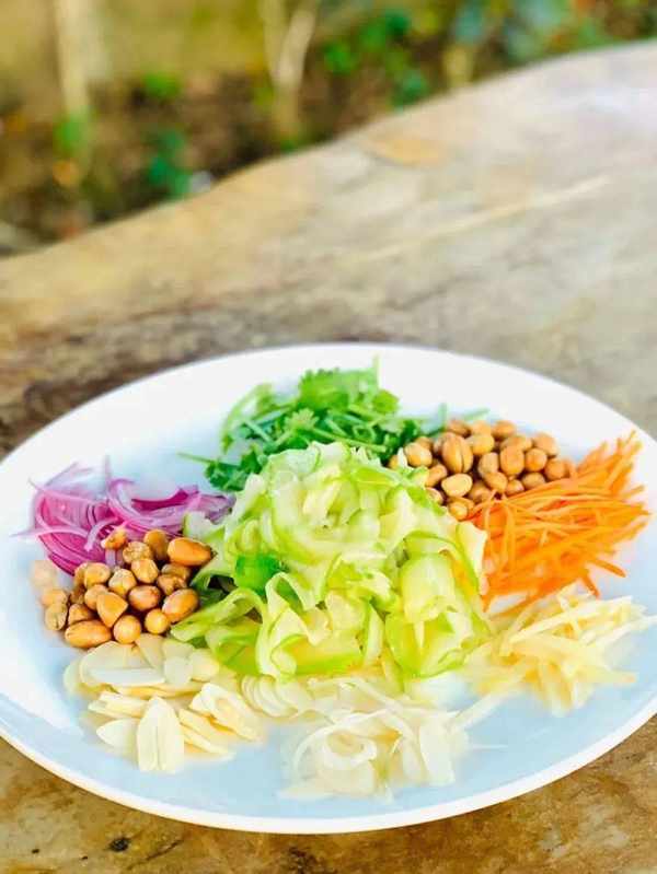 将黑毛节瓜简单焯水,搭配花生、海蜇、秘制姜片、洋葱、香菜、胡萝卜丝等便成为一道入口清脆的凉拌前菜。