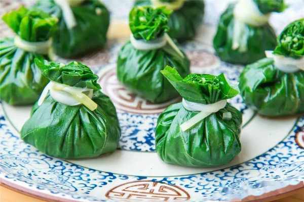 较嫩、较大的桑叶最适合制作桑叶扎。马蹄、红萝卜、玉米、青瓜、豆角、鹅肝等作为桑叶扎的馅料并切丁,用桑叶包好后小料后,用韭黄扎好封口即可。