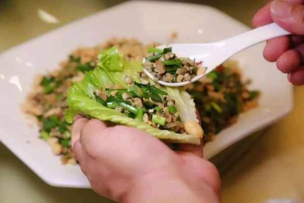 生菜包作为佛山“春宴”的常客,制作难度不大。先将生菜叶洗净,裁成碗口大小,然后把蚬肉焯水煸干,再把蚬肉、叉烧粒、韭菜粒、灯笼椒粒、虾米、葱粒炒熟、炒香,拌匀,撒上炸米粉丝做馅。用生菜叶包裹馅料,佐以辣椒酱,一口下去就是开启这个春天最好的姿势。