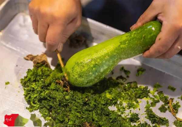 黑毛节瓜多年前就已经成为家喻户晓、走红互联网的绿色食材,所以在许多宴席上都不难发现它的身影。品质佳的黑毛节瓜表皮非常薄,只需用竹签轻轻一挂便能刮下刮皮,露出翠绿的瓜肉。