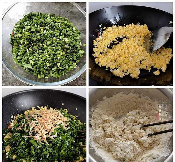 原料:面粉300克,开水110克,凉水60克;韭菜400克,鸡蛋5个,虾壳适量,精盐3茶匙,食用油适量;
