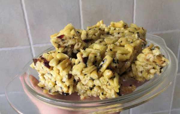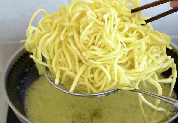 第二步,锅中倒入足量的食用油,烧热,将面条和面条炸至金黄,捞出。喜欢脆一点的记得再炸一遍,准备另一个模具,把面铺在一张油纸上,撒上熟黑芝麻,准备一个干净的锅,加入230g麦芽糖和90克白砂糖,用小火慢慢加热至融化,然后将炸好的意大利面和准备好的坚果放入锅中,搅拌均匀。最后,将它们放入模具中并摊平。冷却后,可以切成块。
