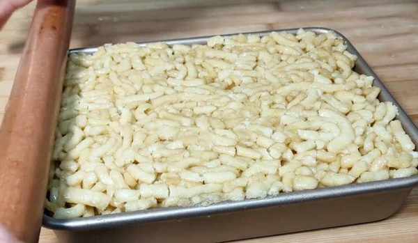 第一步,首先我们取出250g面粉,然后加入2g泡打粉,用棍子搅拌均匀,然后加入4个鸡蛋继续用棍子搅拌成薄片状,用手慢慢揉成球状,盖上盖子打开盖上盖子醒10分钟,然后用擀面杖把面团擀开,用刀切成条状,再切成小块待用。