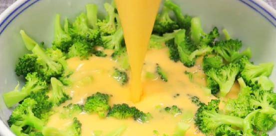 2、将三个鸡蛋打散,直接倒入西兰花中。