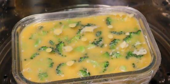 3.碗底刷上食用油,倒入所有西兰花和鸡蛋水,翻炒几下,烧开。盖上保鲜膜,用牙签扎几个小洞,大火煮10分钟。