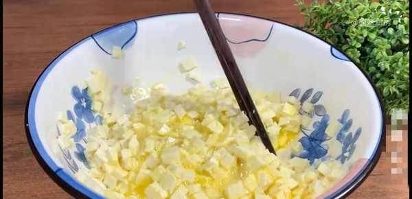 2、锅里放油烧热,将豆腐放入锅中炸熟。直到鸡蛋凝固。加入粉丝丁和香菇丁再次翻炒。然后加入一勺盐、适量生抽、蚝油、五香粉和一勺甜面酱,翻炒均匀,碗中加入韭菜丁拌匀。