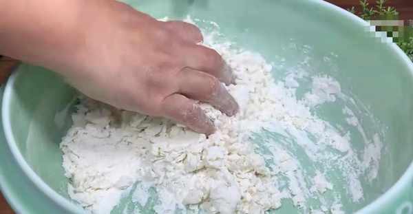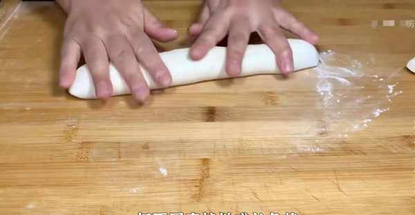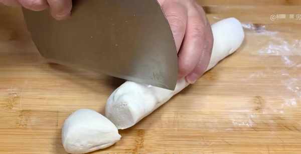 3.和面,取一碗面粉,加入温水和成上图的面条。加入冷水和面,使表面光滑细腻有弹性。然后把面分成两半,把面擀成条状再分成小团备用。