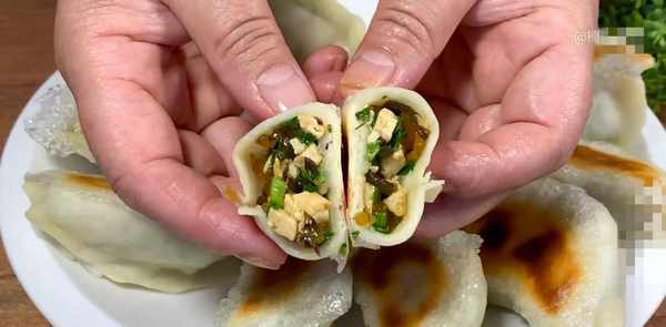 5饺子做好后,准备一张烤盘,在烤盘底部刷一层油。将饺子放在火上,然后放入锅中。不要忘记一个接一个地放,饺子的顶部和锅底要平整。用油刷饺子的顶部。待饺子煎至底部呈金黄色变硬时,倒入淀粉水,用文火煮6分钟。从平底锅中取出并放在盘子上。香喷喷的韭菜豆腐肉饼就做好了。