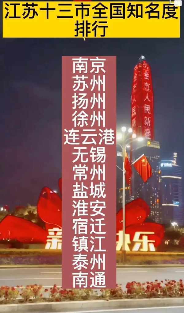 我记得关于南通还有一句字谜:“哑巴打电话—南(难)通”。作为一个江苏人很难客观的评论省内各市的知名度,毕竟或多或少会受到GDP影响。我觉得宿迁和泰州垫底差不多,这两个城市成立时间晚,而且真想不到什么。如果说起项羽和刘大佬,本省的人应该都知道是宿迁的,外省人还真想不到是宿迁的。而泰州更没什么可提的,能想到的就是胡领导,还有就是近年流行的“环高铁城”,至于什么“我们医药城”、“黄桥烧饼”,我想本省人都知道的很少。本图中连云港能排这么靠前有点意外,小时候我知道这个城市是因为书本中提到的“欧亚大陆桥头堡”,但也仅仅是我是江苏人才特别注意的,之所以这么靠前估计是因为“花果山”景区吧,实际上西游记花果山的拍摄地并不在连云港,但不管咋说,这波蹭西游记IP的效果实在很显著。南通排名这么低我想大概是因为没什么很出名的历史人物吧,我知道的张謇也是因为书本中出现,而他又是江苏人的原因。如今南通凭借着不输苏南的GDP,我想知名度终究会上去吧。