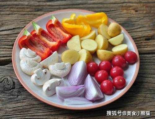 配料:口蘑80克、红椒70克、黄椒50克、小番茄8个、小土豆5个、洋葱80克、意大利黑醋30克、橄榄油30克、海盐、迷迭香适量