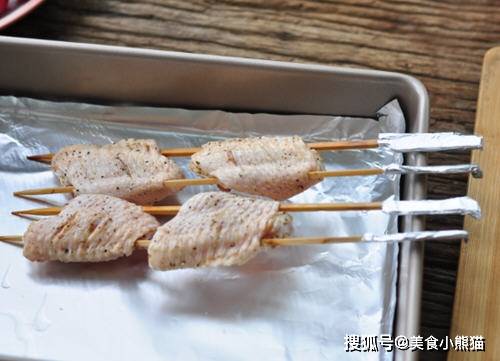 3、竹签子用水煮一下,然后在手柄出缠上锡纸,将腌好的鸡翅穿串。