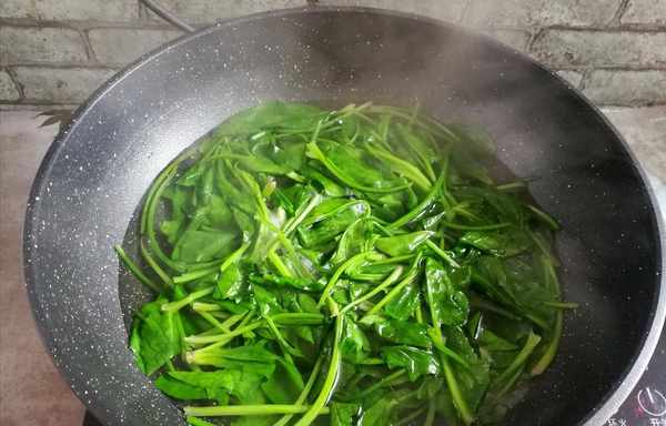 第四步:锅中加入适量水,大火烧开,加入少量盐,菠菜焯水变色后立即捞出。菠菜含有草酸。无论是油炸还是凉拌,都要先焯一下,切不可偷懒。花生刚入锅烤熟,不用加油。菠菜多的话,少量水多焯几次,不要一下子全部加进去。