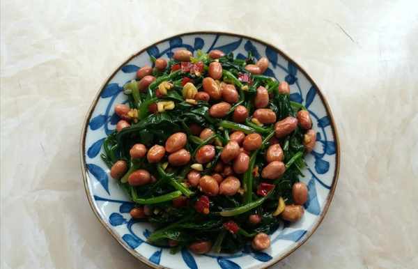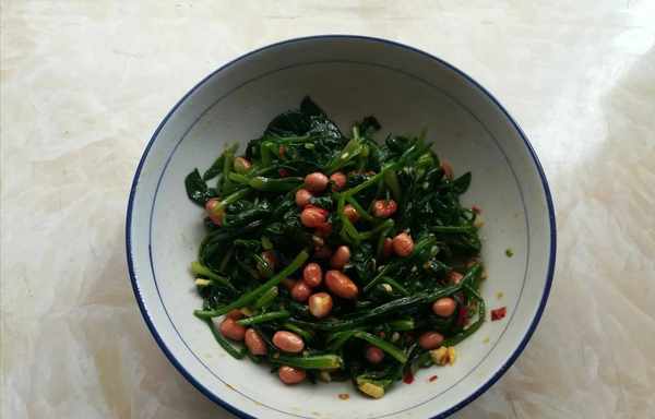 花生拌菠菜做好了,装盘,上桌开吃。把花生放凉再拌入菠菜,味道更佳。这种食物2块钱一只,维生素C含量是苹果的8倍。我的家人必须每隔一天吃一次。