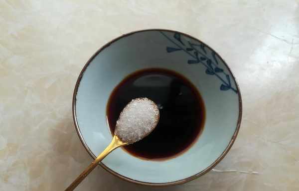 第六步:准备一个小碗,放入2汤匙生抽、1汤匙香醋和1茶匙白糖拌匀。凉拌要用香醋,不要用熟醋,味道太浓了,口感不好。
