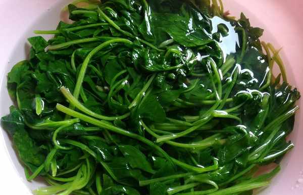 第五步:菠菜用冷水泡一会,捞出沥干水,菠菜放在冷水中可以保持绿色。