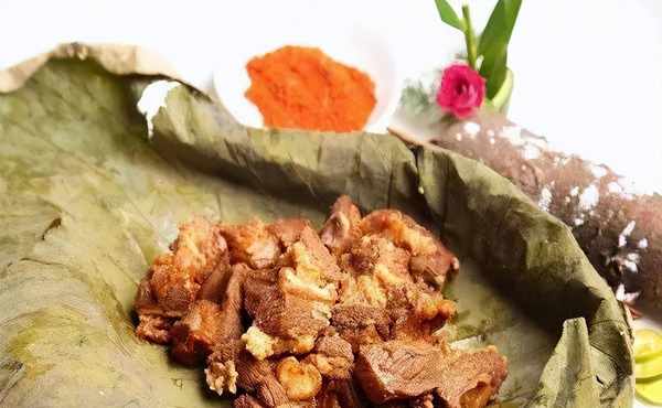 2、上桌时,将煮熟的牛腩放在荷叶上,包好上笼蒸20分钟。取出装盘,稍作装饰,配上辣椒面即可。