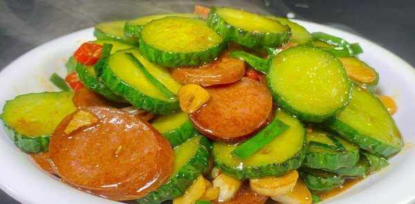 3、黄瓜腌好后,洗净,挤出水分。锅中油热,先将蒜、姜炒香,再放入火腿肠炒至微金黄,放入花椒、黄瓜快速翻炒至断生。然后加入调好的酱汁,炒至顺滑,再加入小葱炒至断,一条鲜嫩香脆的黄瓜炒火腿肠就做好了。