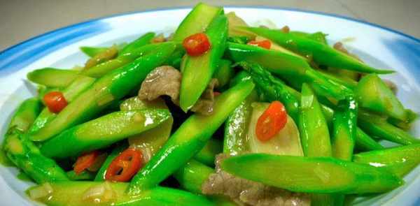 3、锅中倒入适量的水,然后加入一勺食盐和食用油。水开大火后,放入芦笋焯水约30秒,捞出放入冷水中冷却。将肉片炒至变色,捞出油,加入姜、蒜、辣椒炒香。放入芦笋和肉片,放旺火炸,加酱汁,炒出香味,即可出锅装盘,芦笋炒肉就做好了。