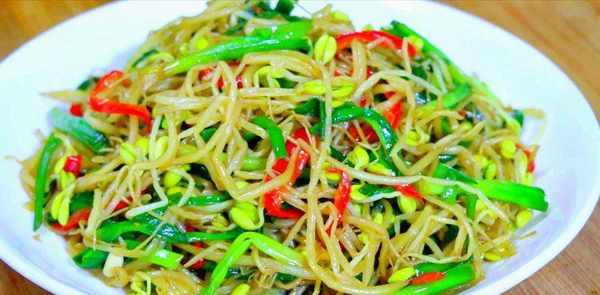 2.在平底锅中加热油。倒入红辣椒、姜末、蒜片炒香,再倒入豆芽,开大火将韭菜炒匀,加少许盐、鸡精,多翻几下,出锅香脆新鲜的韭菜炒豆芽就做好了。
