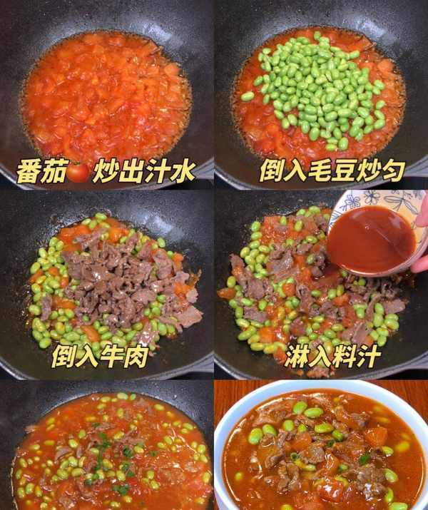 接下来,将少量油倒入锅中,加入切碎的西红柿,炒至变软并流出汁液。将焯好的毛豆放入锅中,炒匀,放入烤牛肉,淋上调好的酱汁,先大火煮,后转小火,慢火煮至汤汁浓稠,最后撒上葱花。.
