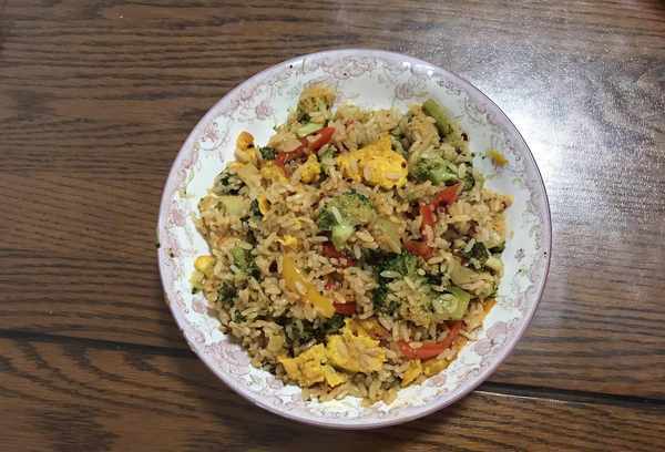 材料:西兰花、鸡蛋、米饭、桃园健民牛肉辣椒、葱姜、酱油、胡椒粉、盐
