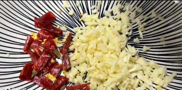 将一些干辣椒洗净,切块。如果说炒青菜好吃,那么辣椒和大蒜就是深情的。家里没有干辣椒,也可以用小米辣椒代替。