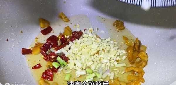 我们加了一点热情,里面的脆皮味道很好。油完全溶化后,倒入辣椒、小葱和大蒜炒香,这样炒出来的青菜就够香了。