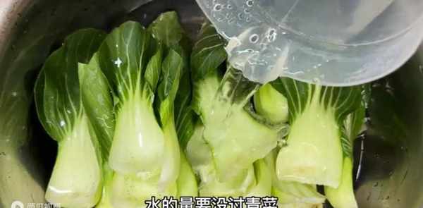 把青菜的叶子一根一根撕下来,把收集好的青菜放到碗里,加一点小苏打,这种叶菜表面很脏,虫卵和一些农药残留很容易繁殖,加清水,清水的量是确定的。盖住青菜,用手轻轻按压,让所有的叶子完全浸没在水里。
