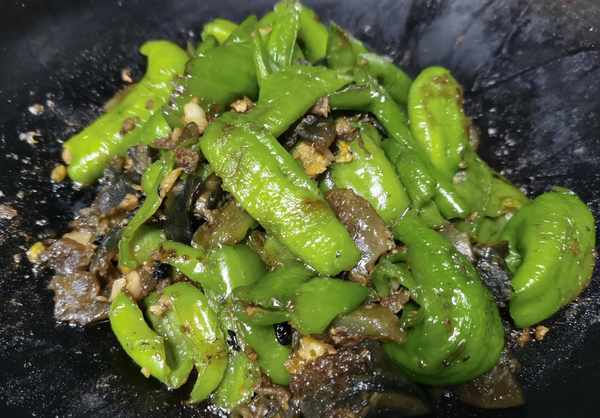 然后,锅里放肥肉,先倒青椒,再倒入姜蒜末和豆豉,小火煮熟,再放普丁,用锅铲敲打。