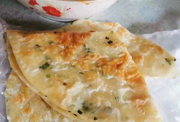 3、面团醒好后,擀成面团,抹上葱油,擀成面团。然后将面团擀成饼状,放入电锅中烘烤至熟。