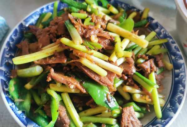 现在春天正是新鲜蒜苔上市的时节。它又甜又脆。这是一道简单的自制牛肉和青椒炒菜。
