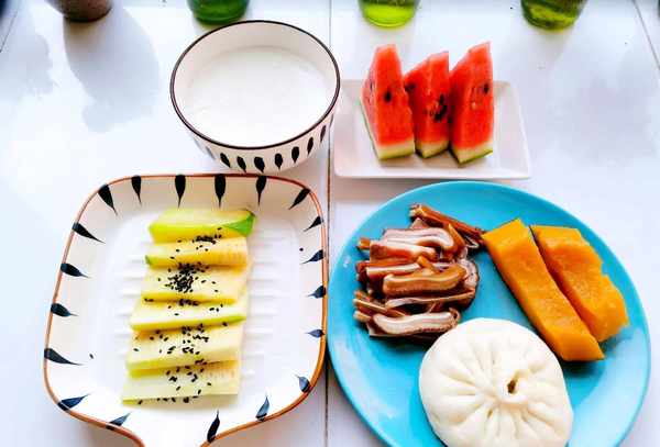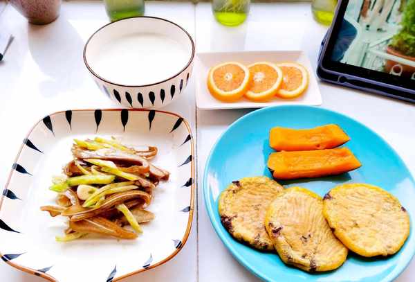 周四早餐:馒头、蒸南瓜、炒西葫芦、猪耳朵、水果、牛奶