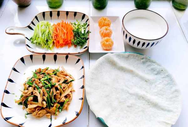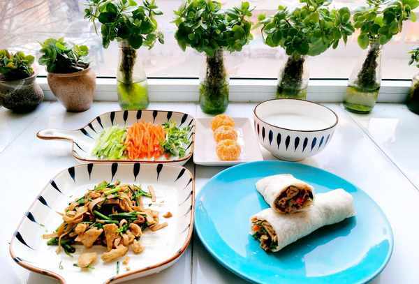 今天的春饼有点大,我只能吃一块。炒蒜苗和鸡蛋,加点豆腐丝,更有营养。我还切了黄瓜丝,磨碎了胡萝卜和香菜,用春饼紧紧地卷起这些色彩缤纷的菜肴,对半切开,吃了一顿美味的早餐。