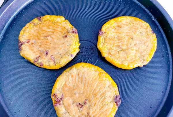 红豆前一天晚上泡好,早上用高压锅煮熟,加糖拌成小豆馅。南瓜泥中加入一把糯米粉和成面团,捏成小团,压扁包上红豆馅,烤成粘稠的南瓜红豆糕,特别好吃。