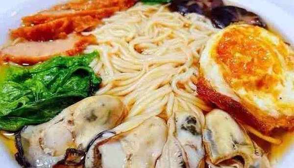 5.将煮熟的意大利面放入碗中,加入一个煎蛋、生蚝、青菜、香骨,最后浇上汤汁。