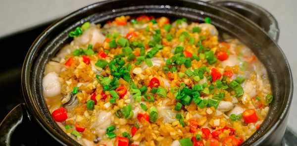 3、砂锅撒上洋葱、金针菇、青椒,撒上蚝肉,均匀撒上调好的蒜蓉酱,盖上锅盖煮3分钟。