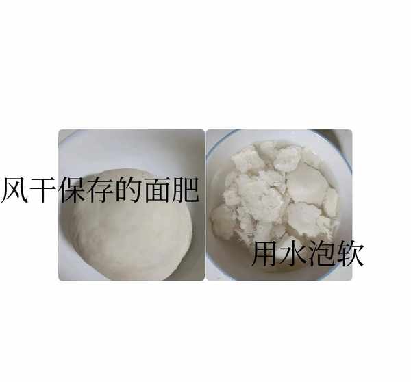 1.激活老脸。将陈年风干面切块,用清水泡透。这时候也可以直接煮意大利面,但是太多的话时间会长,不容易熟,时间太长了也有影响。成品的味道,所以和发酵后的一小碗面(1平碗,大约4-5面)混合,作为新鲜面的肥料,然后正式发酵。