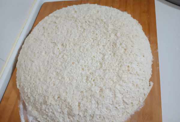 揉好面团后,放在温暖的地方发酵。我一般最多不超过十个小时,大多在五到八个小时之间,就是晚上睡前蒸,或者早上早饭后蒸,或者拌面和晚餐。如果温度高,三四个小时就可以搞定。为保证成品松软,面团要发酵好至少翻倍。有时面团刚刚膨大,体积变大,拉开面团时可以看到蜂窝状。这时候这还不是最好的发酵状态,成品也不好。发的时间太长,味道就不好了。