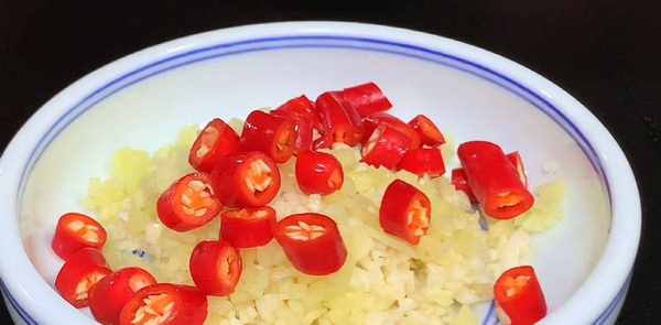 生姜一片切成薄片,刀改成姜末,切姜,将几粒小米椒切成小圆,与磨碎的姜、蒜放在一起。