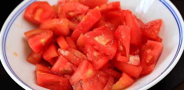 番茄去皮,用不锈钢筷子扎根,放在火上烤至表皮塌陷,稍微晾干,然后用手去皮,然后把番茄分成两份,把它切成小块。把等量的块放在碗里备用。