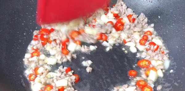 在锅中加入少量食用油。油烧热后,将肉末放入锅中,边不断搅拌边煎匀。将生姜、蒜末和辣椒小米放入锅中翻炒,不断搅拌,直至出现蒜香和辣味。把蘑菇也加入锅里。