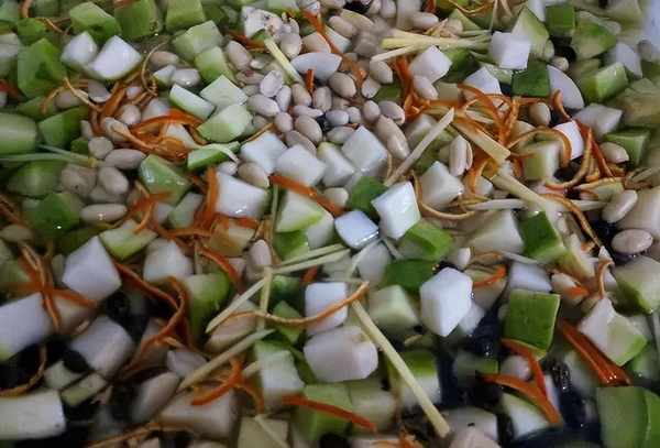 6、碗底放一半丝豆,上面放萝卜,放陈皮末、花生、丝豆和姜丝,加凉盐水,盖上保鲜膜放阴凉处腌制.五天。可以吃
