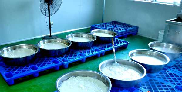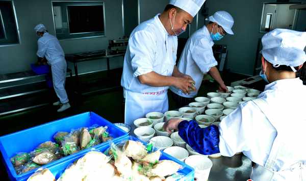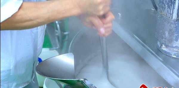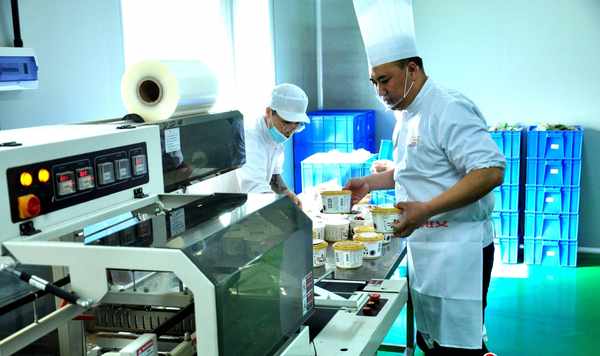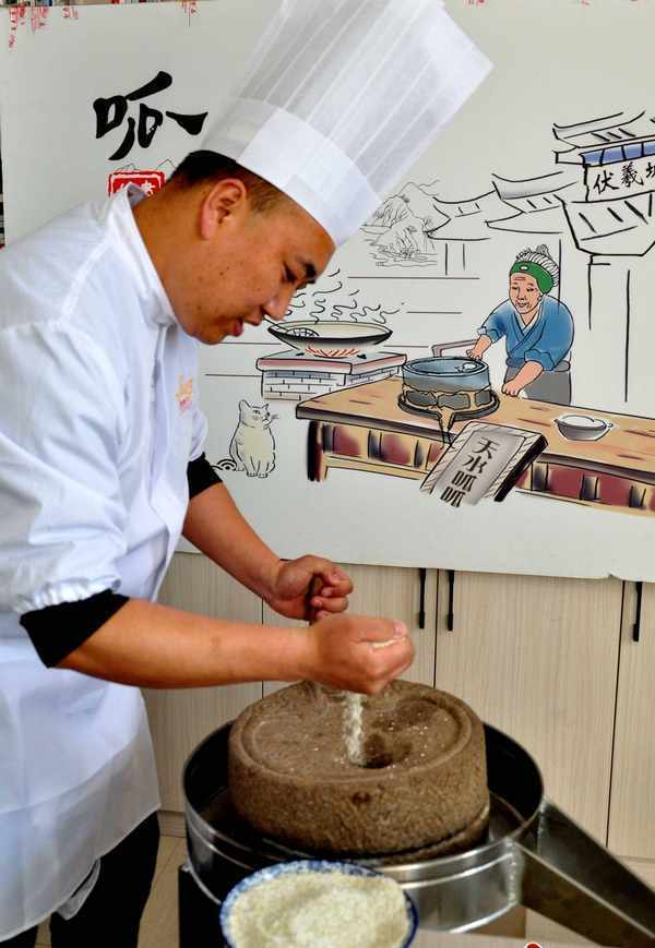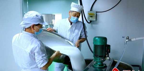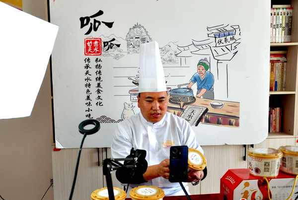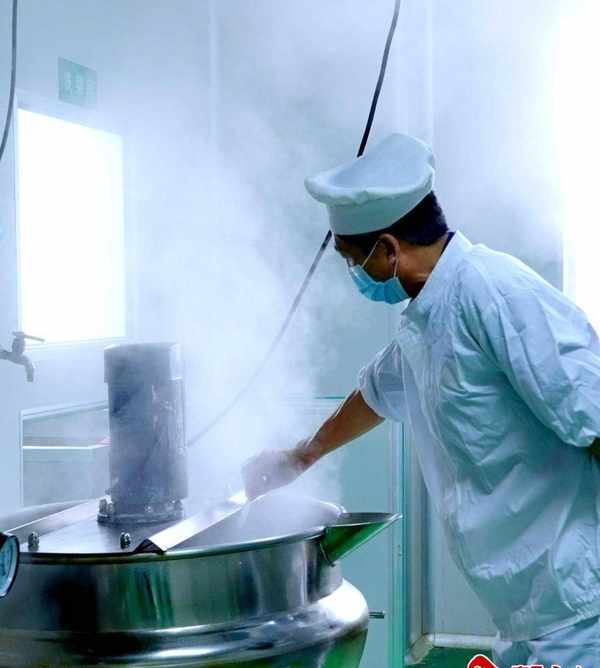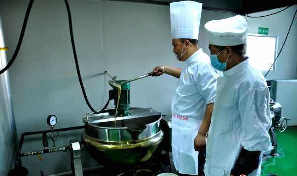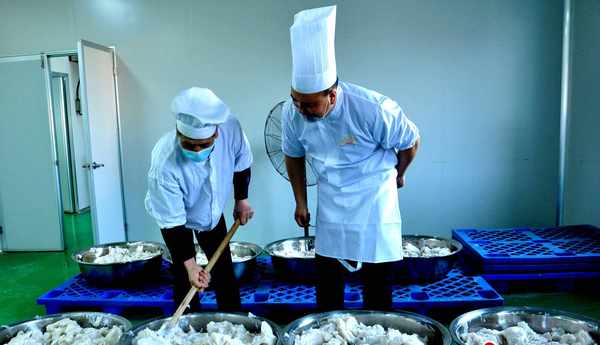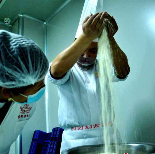 3月6日,在天水英麦香食品有限公司呱呱生产车间。位于钦州区暖河湾工业园区的天水省无形呱呱制作技艺传承人王瑞兵指导工作人员准备以后做菜时搅拌几次(搅拌几次味道会更好)。虽然每条生产线的工人都是专家,让消费者吃的放心,吃到地道优质的天水瓜瓜,但王瑞兵关注生产的每一个环节,要求员工不断改进。