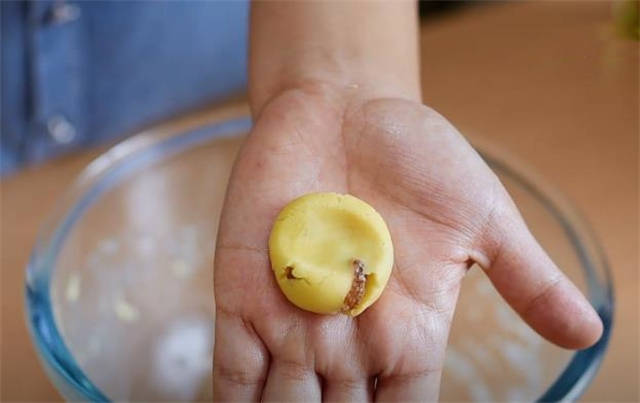 2.处理小面剂的时候也特别简单,直接就取一小块出来在掌心团圆,用大拇指稍微按扁,这个小剂子就出来了。