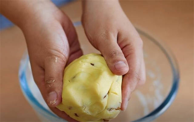 1.先准备60g软化好的黄油,再放20g糖粉,简单拌匀之后我们用打蛋器打发,打了三分钟之后,我们放130g的低筋粉,再放一把葡萄干,把黄油和面粉充分搅匀就可以开始揉面了,这种面团特别好揉,简单的几下就揉到这种光滑的程度了。