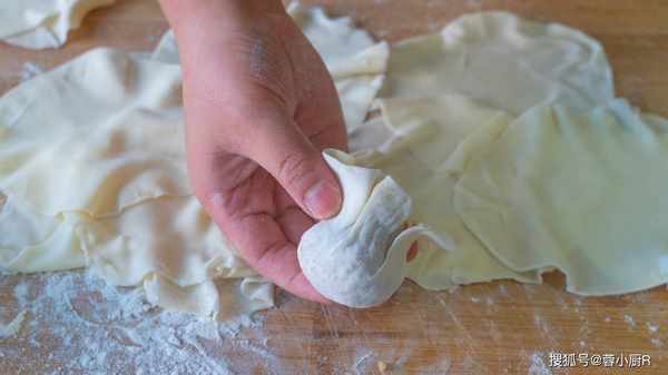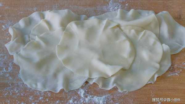 13、我们再来准备3块钱的饺子皮,10张为一组,撒点干面粉后稍微地擀开擀大一点,然后再捏出花边。这样比较简单快速,捏好后再把饺子皮一张张地分开。