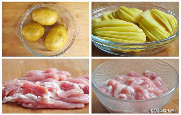 2、趁着蒸土豆的时间我们来准备点配菜,猪肉一小块,切条,加一个蛋清腌制20分钟,用手抓一抓,让肉跟蛋清更加的融合在一起,蛋清可以锁住肉的水份,让肉的口感始终保持滑滑的;