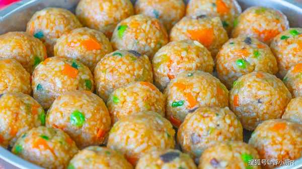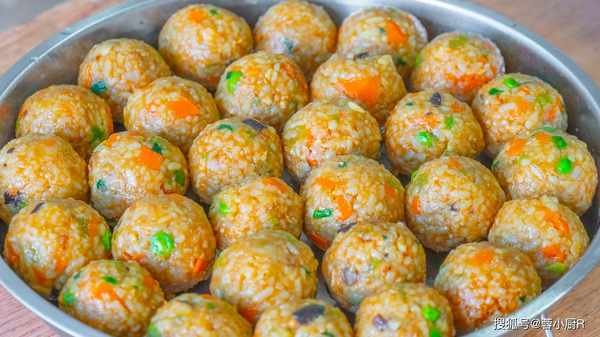 11、最后再倒入少许的香菇水,大火继续翻炒一会儿,把香菇水收干后就可以了,出锅前撒上一把葱花,拌匀就可以了。这个大米饭调的馅儿也是超级香,先稍微的放凉一会儿,然后取一小坨,先捏瓷实,再搓圆,搓成像这样一个小圆球就可以了。
